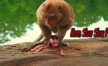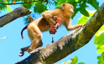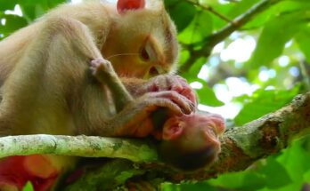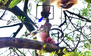 Breaking Heart: Poorly Baby Monkey Really Crying ‘Cos Mom Training It Strong on Very High Tree In the heart of the jungle, where the trees sway high in the sky, …