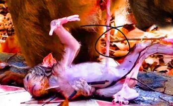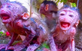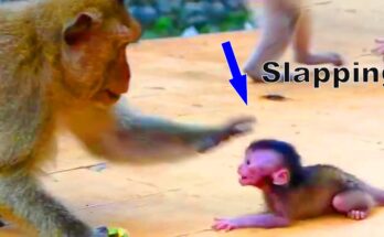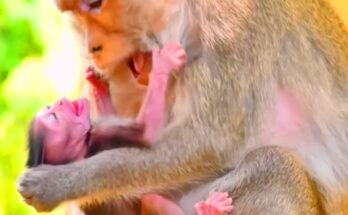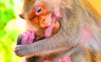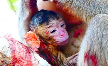 In the quiet corner of the forest, the air was still filled with the heavy scent of birth. A young mother monkey had just delivered her tiny newborn. Her body, …