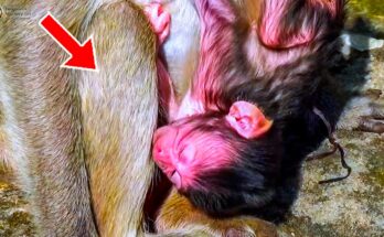 In the quiet corner of the forest, a beautiful moment unfolded. A young mother monkey had just given birth to her tiny baby, a fragile little being with soft fur …