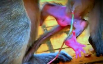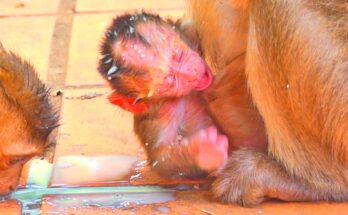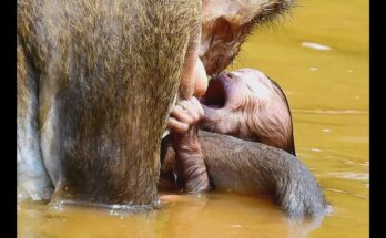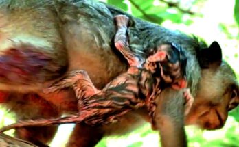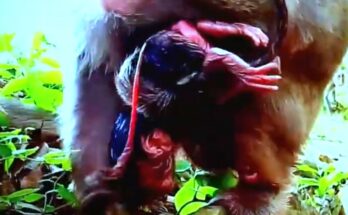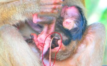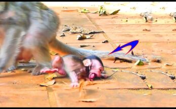 Under the warm sunlight, a tiny baby monkey lay stretched out on the soft ground, looking both playful and innocent. Its small body seemed so fragile, yet every little movement …