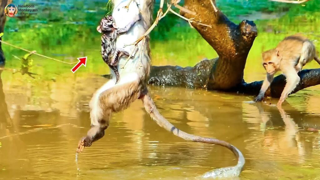 In a heart-wrenching and terrifying moment captured in the wild, a tiny baby monkey was seen struggling to breathe after being accidentally left behind as its mother leapt into a nearby stream. The unexpected scene unfolded when a group of monkeys approached a river to cool off during a hot afternoon. Most of the adults, including the mother, jumped confidently into the water. But in her quick movement, the mother didn’t notice that her newborn clung weakly to a branch nearby, not strong enough to follow.